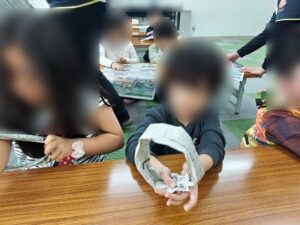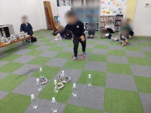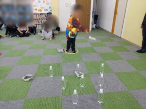今回は輪投げの輪を作るところから始めました。同じ大きさの新聞紙で作りましたが、縦に横に、また斜めにと自分なりに工夫して作っていました。いざ輪投げを始めるとなかなか入らず「入らんし・・・」「悔しい!」と苦戦する子が多かったです。縦から投げてみたり、横から投げてみたりと投げ方も工夫していました。一つ入ると嬉しそうに「次はもっと入れる!!」と何度も取り組んでくれていました。友だち同士でアドバイスをし合う姿もあり、最後まで諦めずに挑戦する姿がとても素敵でしたよ!