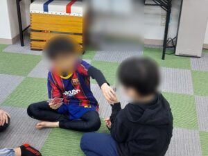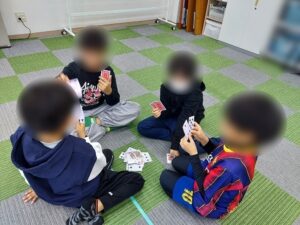 今回はババ抜き、一休さんなど色々なカードゲームを行いました。ババ抜きでは友だちの表情などから誰がジョーカーを持っているのかを探り「怪しいな・・・」「○○くんが持ってそう」と駆け引きを楽しんでいました。一休さんではどのタイミングで1・9・3が出てくくるかが分からないため、カードをめくるたびにハラハラドキドキしながら、数字が出ててくると「一休さん!!」と嬉しそうにコールしていました!惜しくもカードが取れなかった子も「次は取るから!」と気持ちを切り替え最後まで楽しんでいました。他にも絵合わせパズルやナインタイルというカードゲームも行いました。ルールが難しかったり、なかなか思うようにいかず、また勝てなかったりと悔しい思いをすることもあったと思いますが、ルールを守り最後まで取り組んでくれていました。
