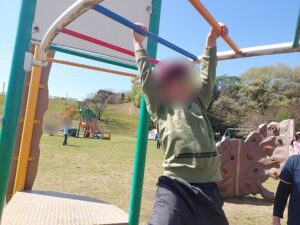前日の雨で地面は濡れており、風が強かったですが天候には恵まれ、久しぶりに公園に行くことができました。フリスビーやバトミントンなどは風が強かったこともあり思うように遊べず、今回は滑り台やターザンロープなどの固定遊具で遊びました。残念ながら桜は散ってしまっていましたが、他の花や虫などはおり、春の訪れを感じながら伸び伸びと体を動かすことができました。蛇にも遭遇し「うわ~、蛇や!!」と大興奮の子どもたちでした。