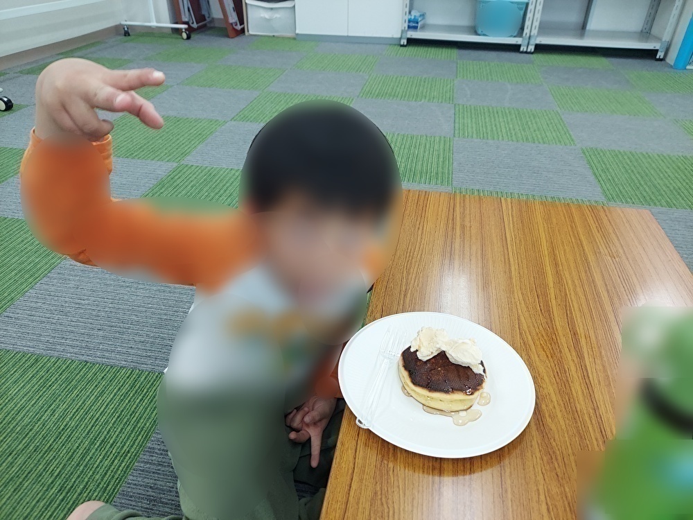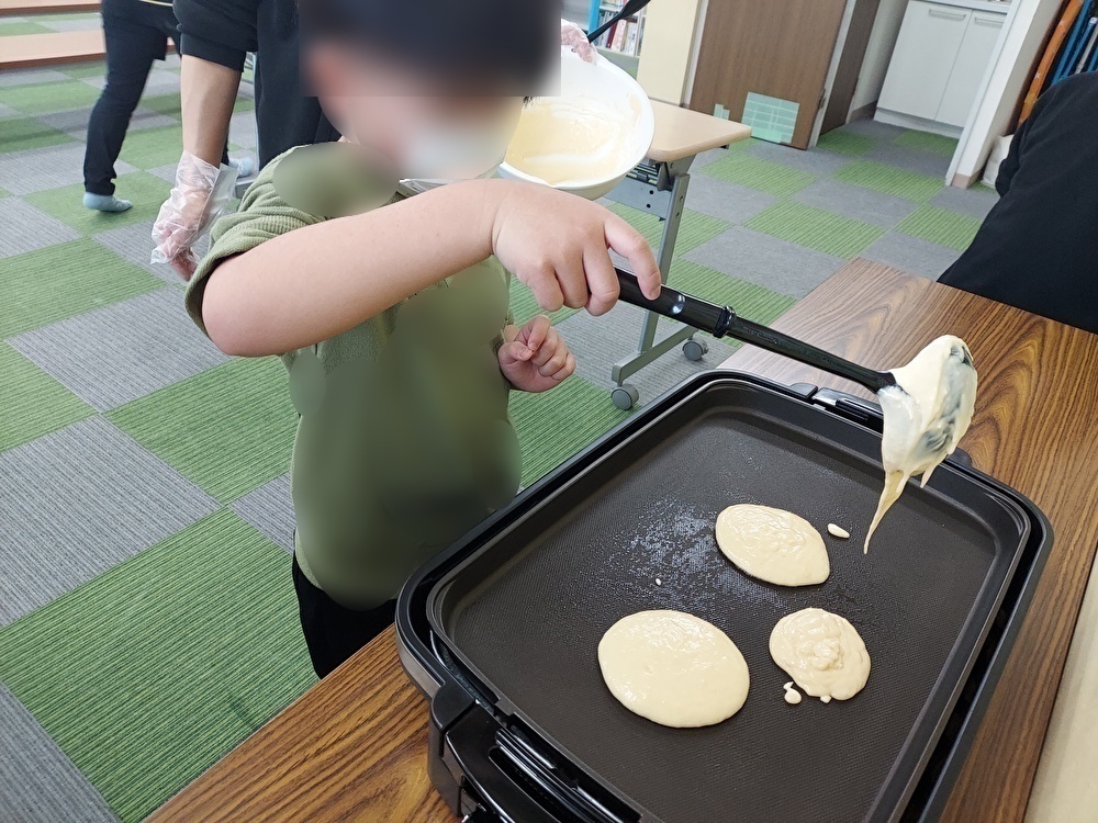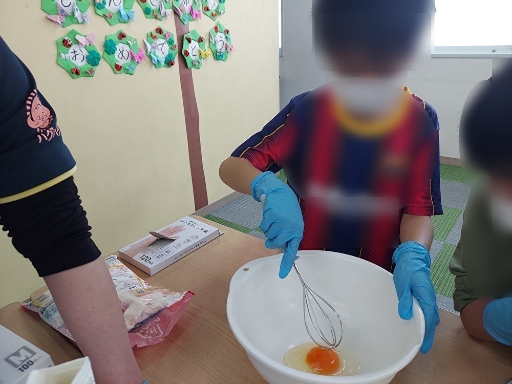 子どもたちの楽しみにしていた調理実習をしました。手をしっかりと洗ってゴム手袋をつけていくのですが、1年生は初めてのため、指導員と一緒に指の場所を合わせながらつけていきました。計量カップの使い方を確認して牛乳をゆっくりと入れていきました。ボウルに牛乳、卵、ホットケーキミックスを交代に混ぜていき「はやくやりたーい」とやる気満々でした。ホットプレートにゆっくりと流していきました。良いかおりがして「おなかへったー」と待ちきれない様子でした。トッピングにアイスクリーム、ホイップ、チョコソース、バター、メイプルシロップと子どもたちはワクワクしながら好きなトッピングをつけてみんなで「いただきまーす」とおいしそうに食べていました。