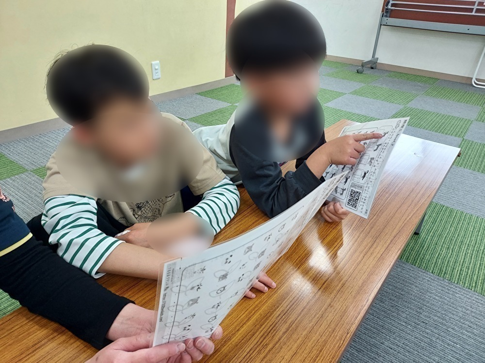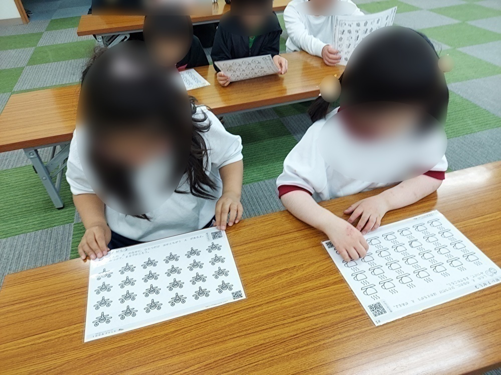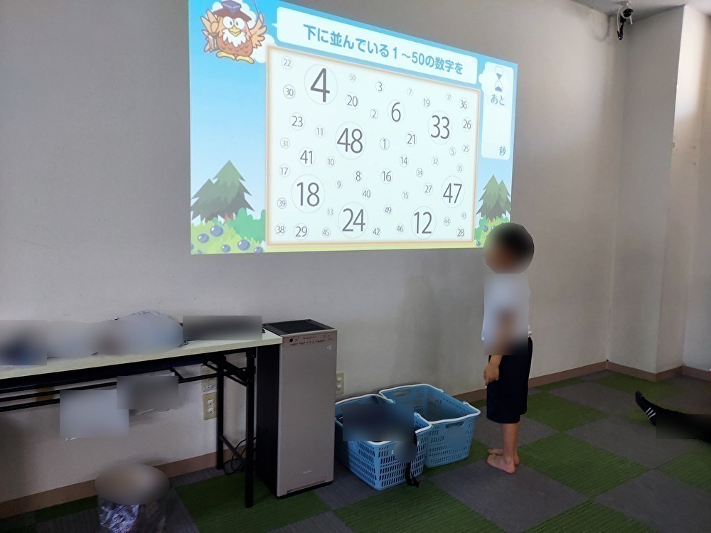 映像やプリントを使ってビジョントレーニングをしました。大きさが違う1から50までの数字を順番に見つけていきました。数字が小さく書かれた状態から大きくなったりするなど見つけにくく、見つけ終わると「おわったー」と喜んでいました。次にプリントでたくさん描かれた同じ絵から1つだけ少し違う絵を探していきました。どこが違うかわからないため、1つ1つポイントを見て探していました。見つけたら「つぎのやる!」と全部のプリントをコンプリート目指す子もいました。最後に同じ絵を数えることもしました。似たような絵がたくさん描かれているため、同じ特徴を確認しながら集中して見つけていましたよ。