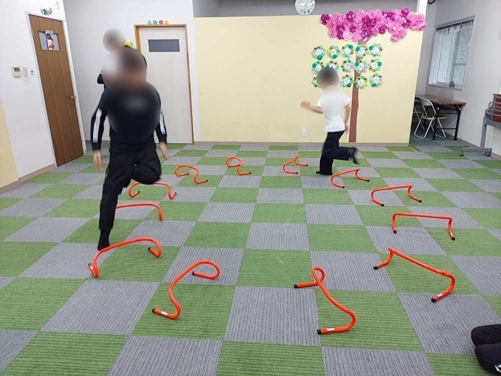 動かし方や俊敏性を高めよう!ラダーやミニハードルを使って体を動かしました。準備体操でラジオ体操を第一から第三をしました。既存の子は何度かしているため、自信満々にしていました。初めての子は体の動かし方が難しく苦戦をしていましたが一生懸命に動かしていました。はじめにミニハードルを使って両足ジャンプや足を交互に動かしていきました。ミニハードルを倒さないように慎重に動く子やスピードを意識して速く移動をする子もいました。次にラダーを使ってクイックランやスラロームジャンプなどをしました。「ジャンプ、ジャンプ」と次に行く方向を考えながらジャンプをしてたくさん体を動かしました。