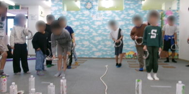 ◇(人間関係・社会性)…みんなで協力して輪投げを楽しもう!今日は輪投げの活動でした。最初は輪投げに使う輪とペットボトルに貼る点数を作…